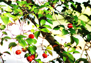 Abro a janela e vejo a pitangueira dando seus primeiros frutos, este ano nem percebi quando ela floresceu...